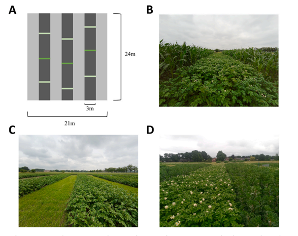 Het doel van deze studie was om het effect van strokenteelt op de ontwikkeling van Phytophthora infestans in aardappel, met verschillende buurtgewassen, te onderzoeken. Buurtgewassen waren: gras, mais of veldboon.